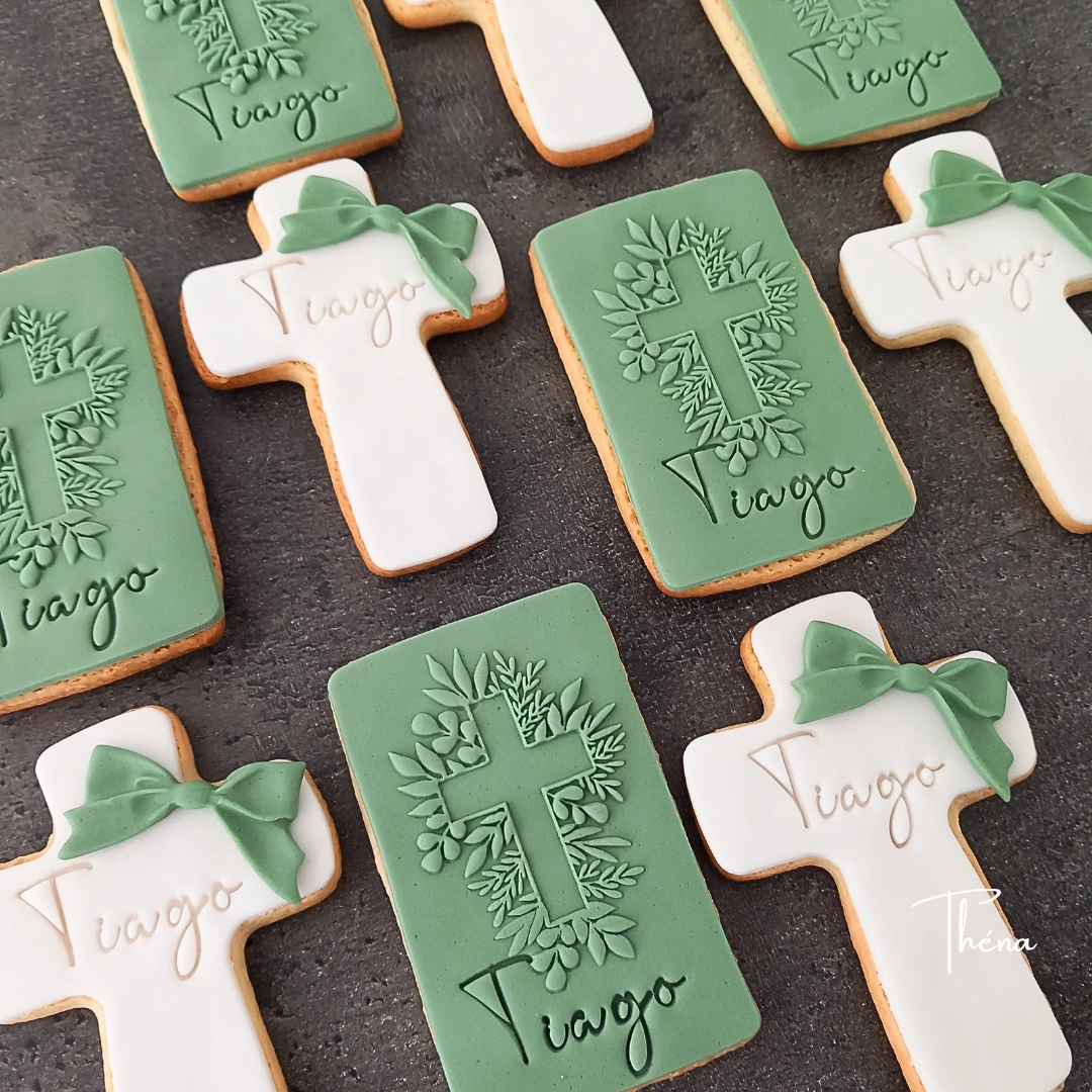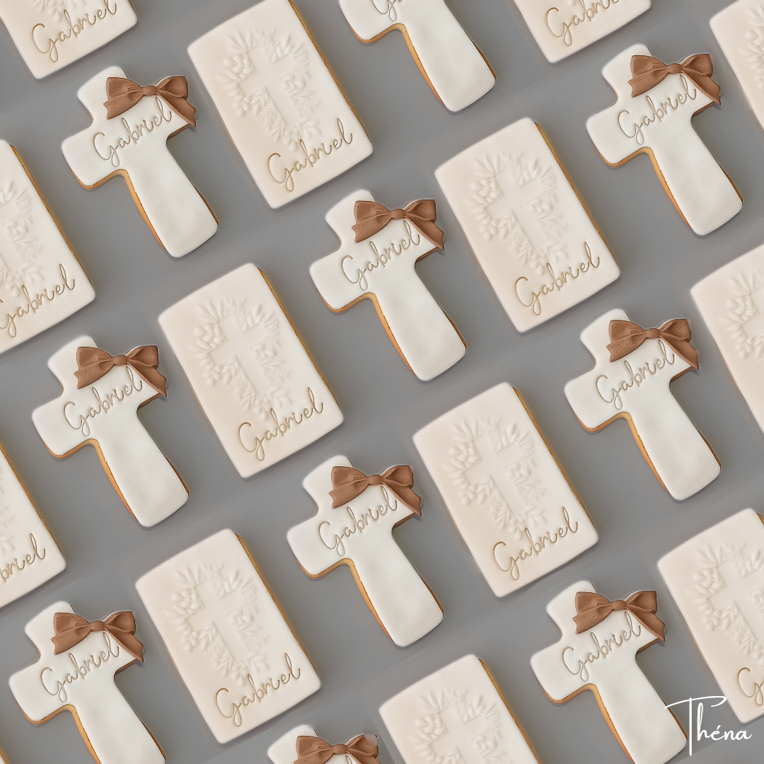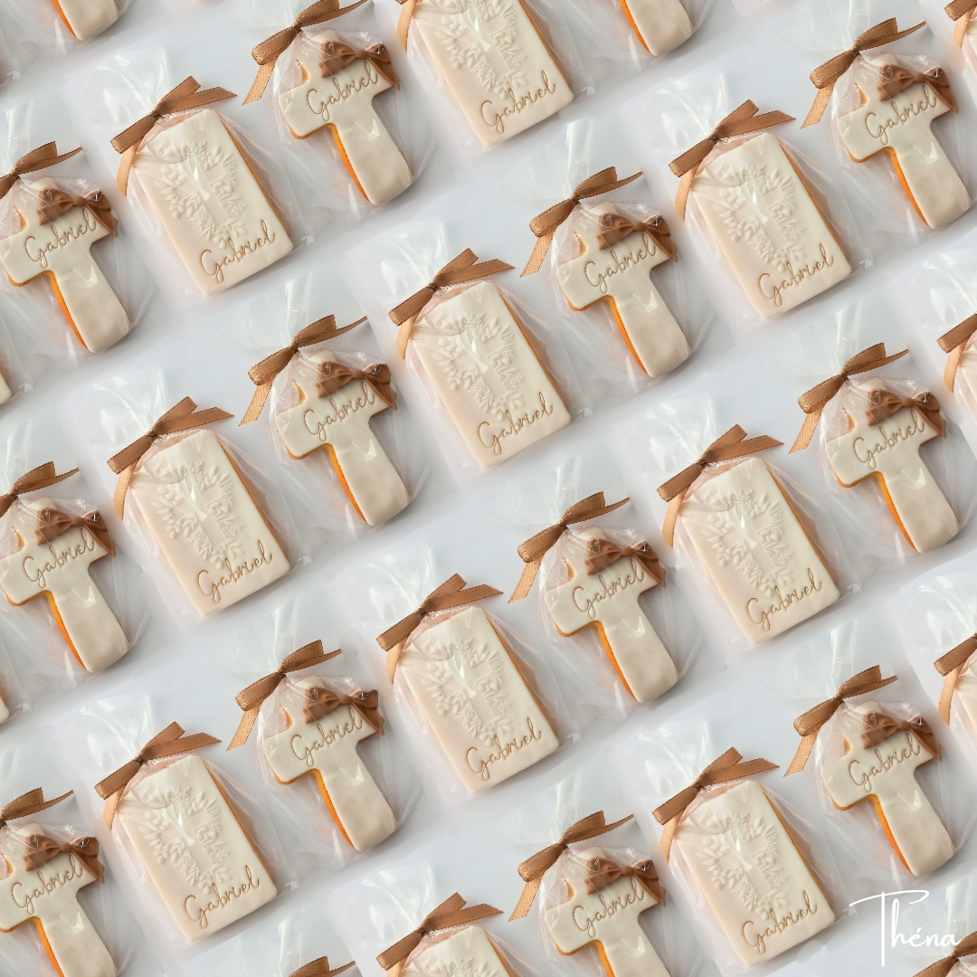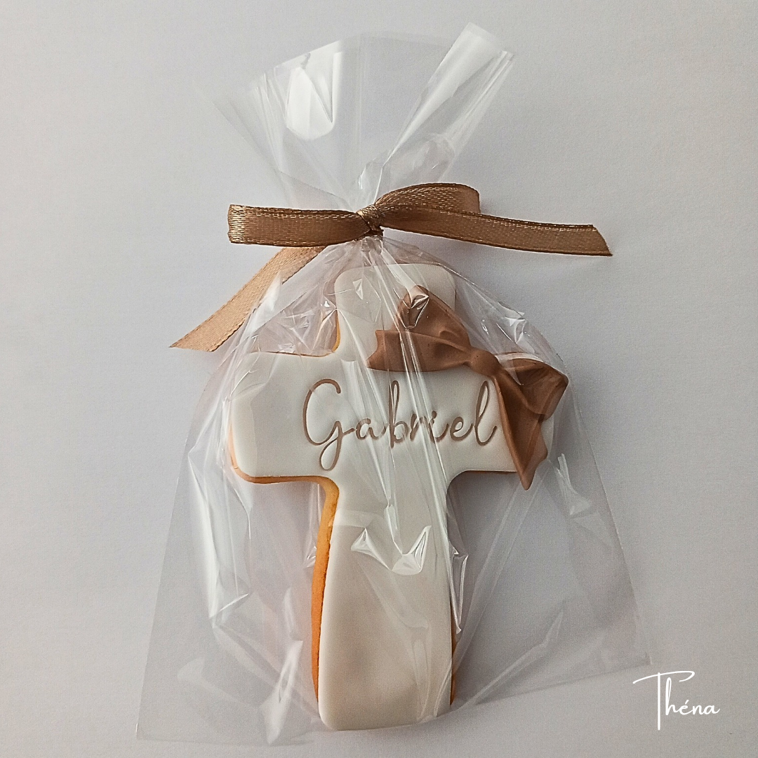 De jolis biscuits au beurre recouverts de pâte à sucre vanillée, personnalisés avec le prénom de votre choix. Couleur du ruban et de a pâte à sucre personnalisables. Idéals pour un baptême, une communion ou une profession de foi. Faits main avec amour, ils se conservent 6 semaines après fabrication.