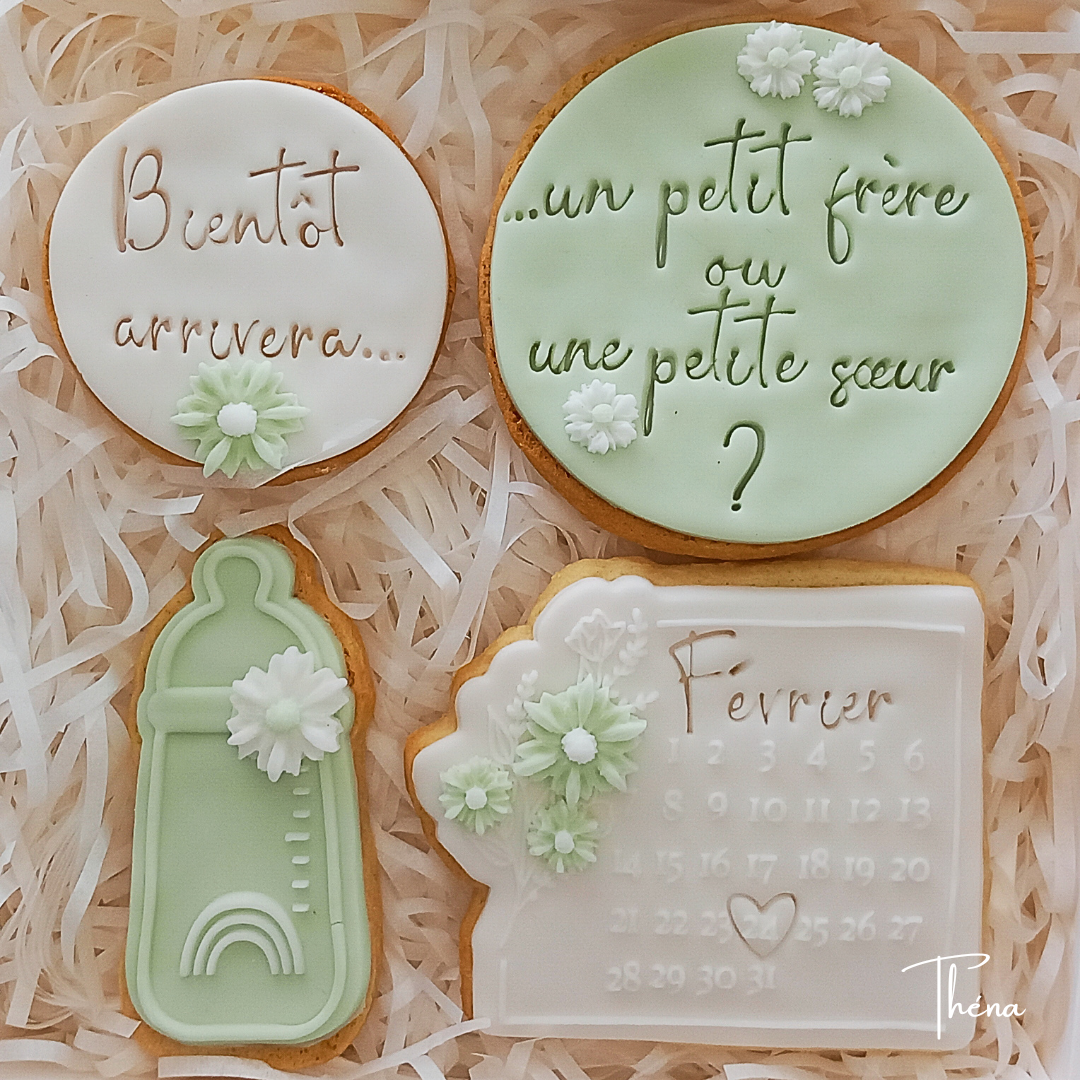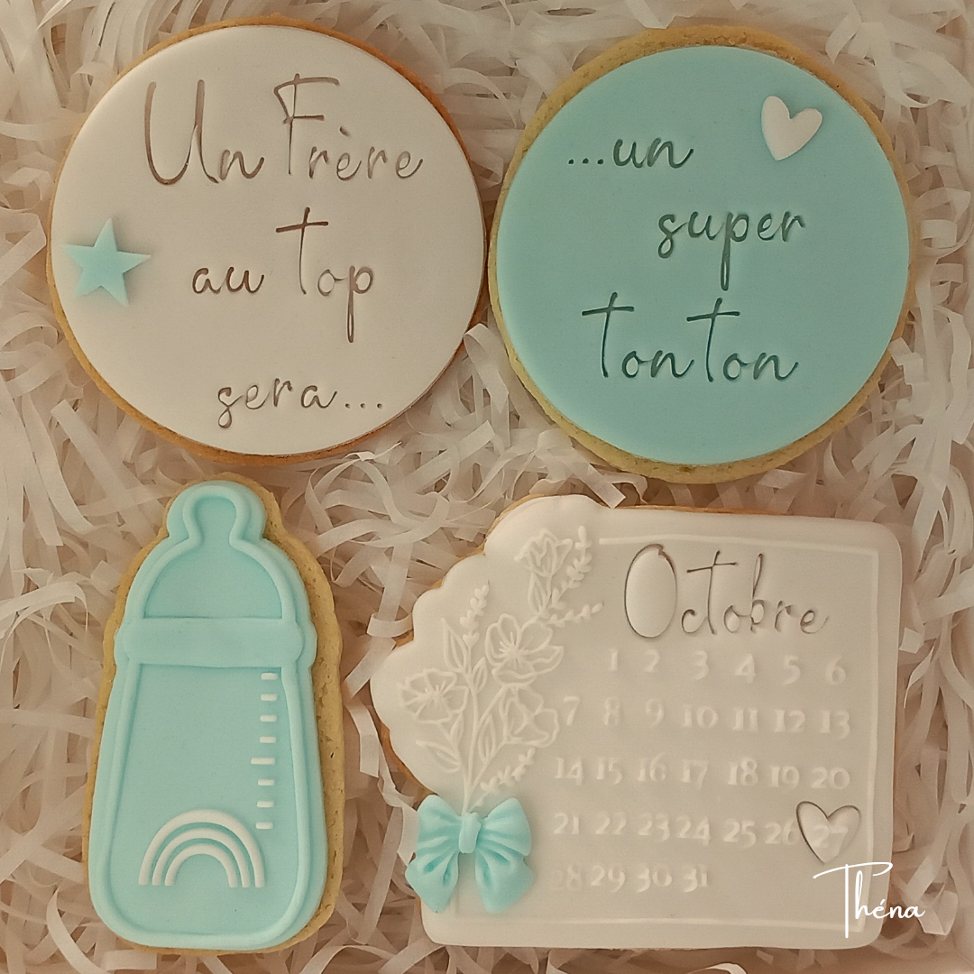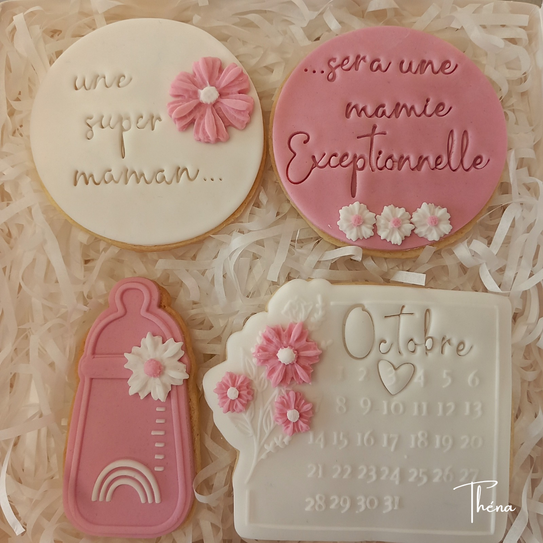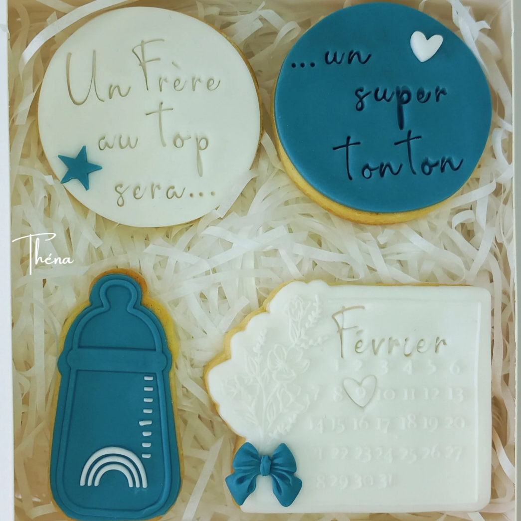 Un cadeau original pour annoncer votre grossesse à vos proches. Créez un instant unique avec ces biscuits élégants et délicieux. Vous souhaitez annoncer la nouvelle le plus rapidement possible, nous pouvons réaliser vos boîtes sous 72 heures !