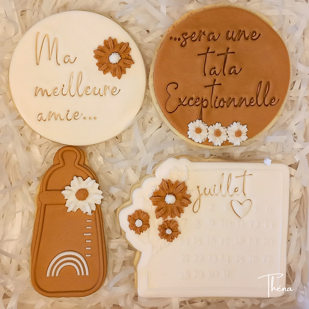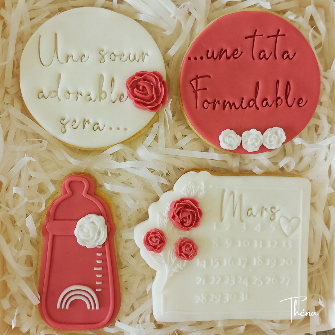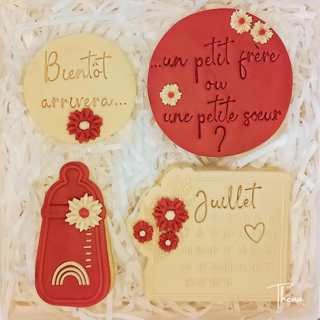 Un cadeau original pour annoncer votre grossesse à vos proches. Créez un instant unique avec ces biscuits élégants et délicieux. Vous souhaitez annoncer la nouvelle le plus rapidement possible, nous pouvons réaliser vos boîtes sous 72 heures !