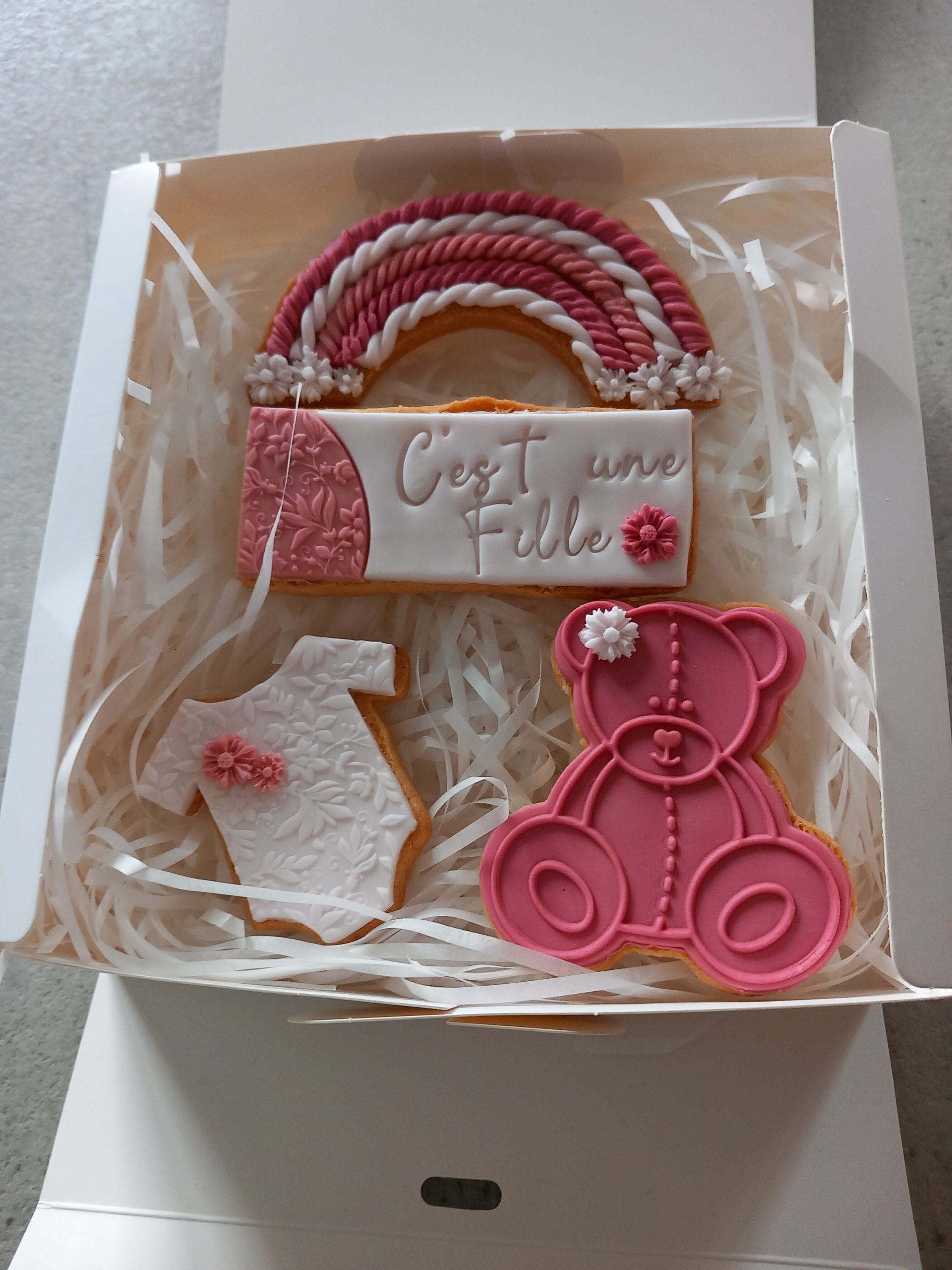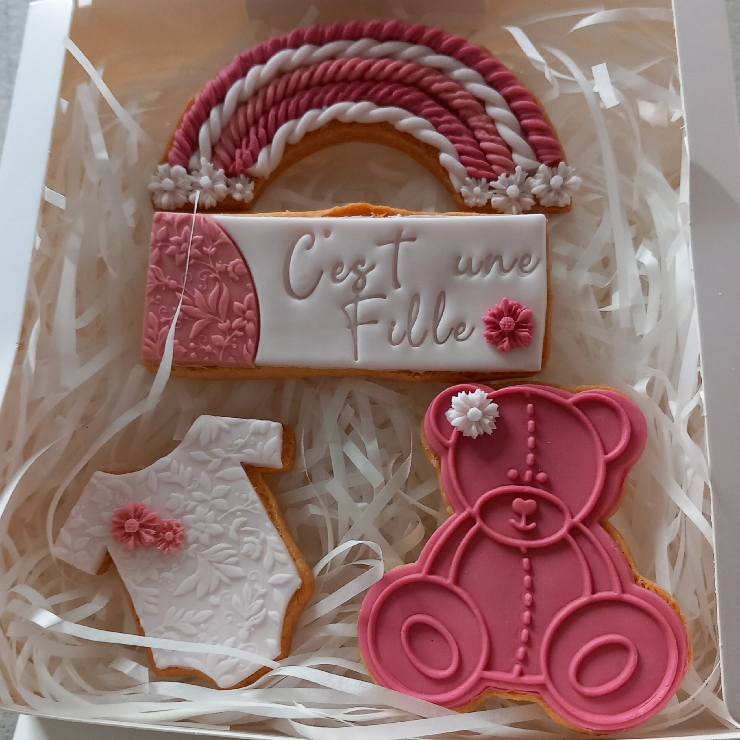 Un cadeau original pour annoncer à vos proches que vous attendez une petite fille. Créez un instant unique avec ces biscuits élégants et délicieux.