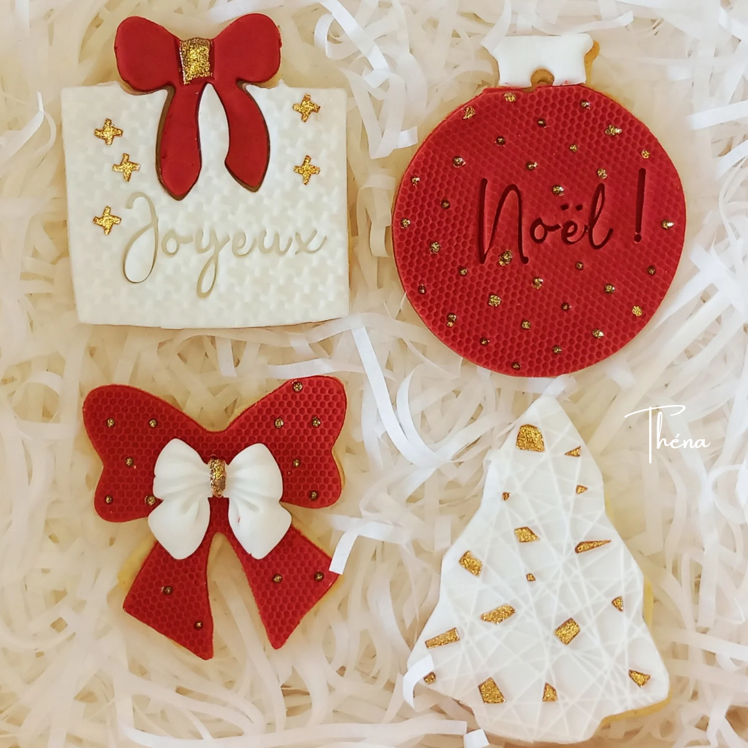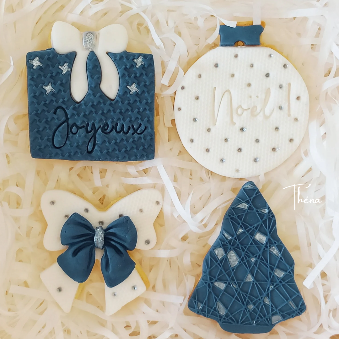 Le coffret contient 4 formes iconiques de Noël : un sapin, un cadeau, une boule de Noël et un noeud élégant.