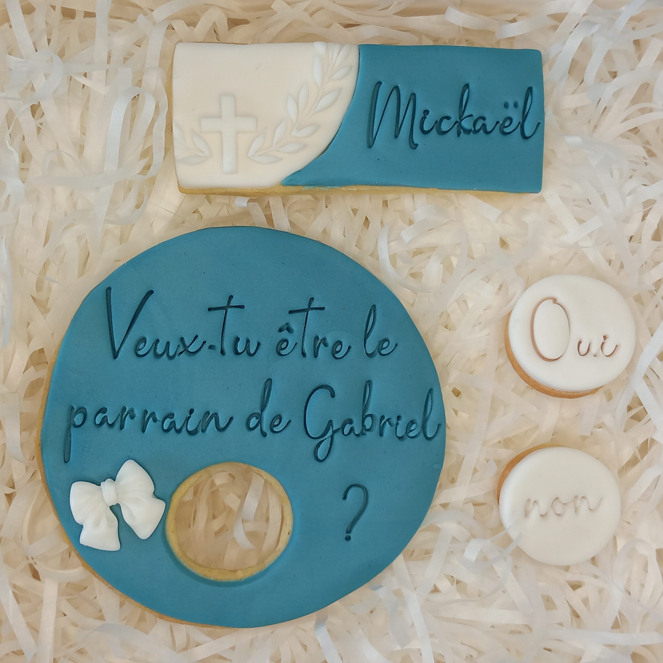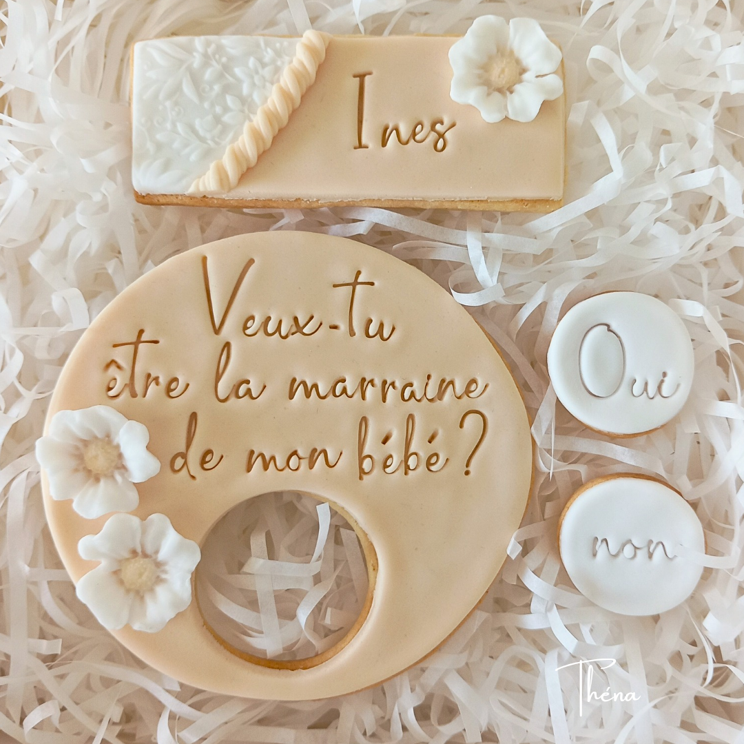 Un cadeau original pour faire votre demande pour le futur baptême de votre enfant. Créez un instant unique avec ces biscuits élégants et délicieux.